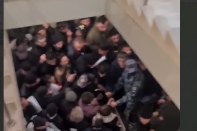 На записи видно, что лестничные пролеты в здании заполнены людьми. На снимках также можно заметить сотрудников полиции, которые пытаются урегулировать ситуацию.