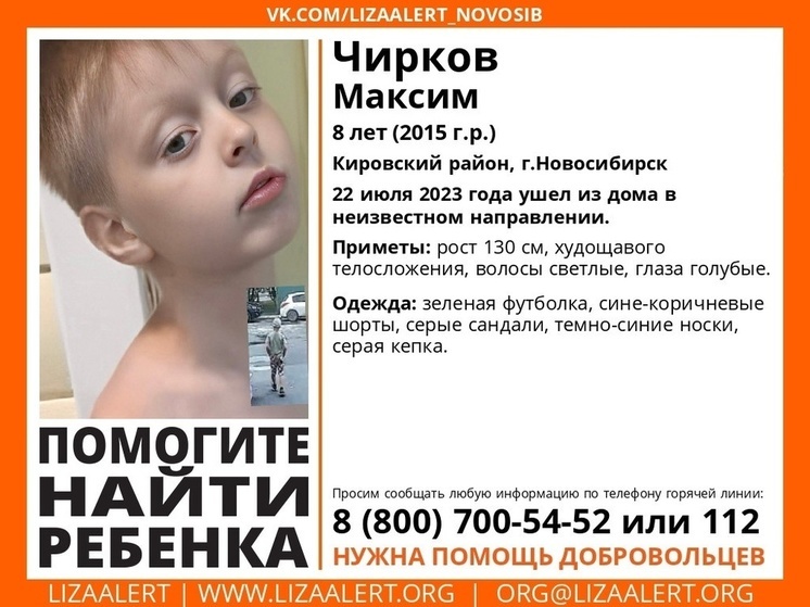 Волонтеры отряда «Лиза Алерт» обратились к жителям Новосибирска с просьбой помочь в поисках 8-летнего Максима Чиркова, который пропал в Кировском районе. Согласно данным, ребенок ушел из своего дома в Кировском районе и не вернулся. На данный момент его местонахождение неизвестно.